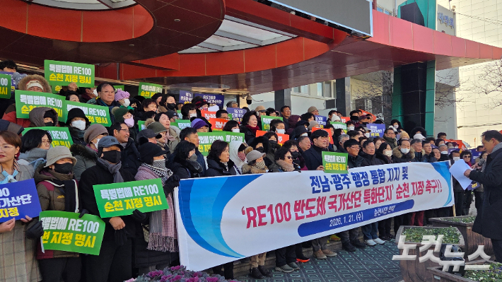 순천시민연대, RE100 반도체 국가산단 순천 지정 촉구 전남 순천시민연대는 21일 오전 순천시청 앞에서 전남·광주 행정통합을 지지하며 'RE100 반도체 국가산업단지'의 순천 지정을 촉구했다. 이들은 성명을 내고 "전남·광주 행정통합 추진 과정에서 전남 동부권이 소외돼서는 안 되며, 순천 지정이 통합의 실질적 성과를 보여주는 계기가 돼야 한다"고 강조했다. 2026.01.21 11:27