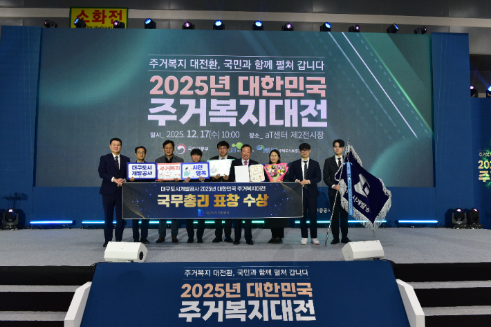 대구도시개발공사, 대한민국 주거복지대전 국무총리 표창 대구도시개발공사는 '2025 대한민국 주거복지대전'에서 국무총리 표창을 수상했다고 18일 밝혔다. 대한민국 주거복지대전은 지자체, 공공기관 등이 주거복지 성과와 경험을 공유하는 행사로, 매년 우수한 정책과 성과를 거둔 기관을 선정해 포상하고 있다. 2025.12.18 13:28