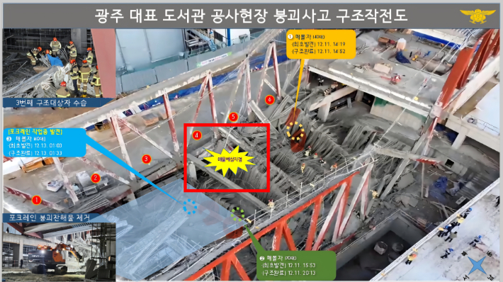 광주 도서관 붕괴 현장 안정화 작업 막바지…곧 수색 재개 될 듯[영상] 소방당국이 광주 도서관 신축 공사장 붕괴 사고 현장에서 마무리 안정화 작업을 진행하며 매몰 노동자 2명에 대한 본격적인 수색 재개 준비에 들어갔다. 2025.12.12 23:21