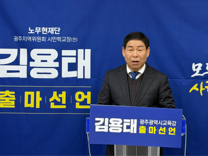 김용태 전 노무현 광주시민학교장, 광주교육감 출마 선언 김용태 전 노무현재단 광주지역위원회 시민학교장은 23일 광주광역시교육청에서 광주시교육감 출마를 공식 선언했다. 김용태 광주시교육감 출마 예정자는 "지금 광주교육은 멈춰 서 있다"며 "잃어버린 신뢰와 희망을 회복하고, 사람을 키우는 교육, 모두를 위한 교육으로 광주교육의 대전환을 이루겠다"고 밝혔다. 2025.12.23 11:37