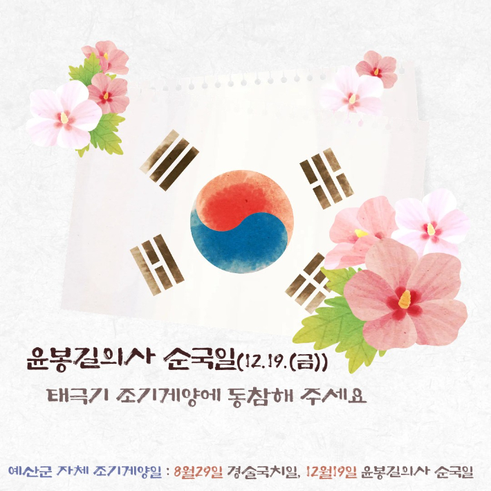 12월 19일은 윤봉길 의사 순국일…예산군, 조기 달기 운동 충남 예산군이 예산 출신 독립운동가인 매헌 윤봉길 의사의 순국 제93주기인 19일 조기(弔旗) 달기 운동을 추진한다. 예산군은 군 소속기관과 산하기관뿐만 아니라 민간기업과 단체, 일반 가정에서도 조기 달기에 참여할 수 있도록 독려하고 있다. 2025.12.18 11:05