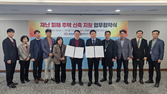 '재난 피해 주택' 건축전문가와 복구 동행한다 충남도와 충남건축사회가 집중호우 등 재난으로 무너진 주택의 신속한 복구를 위해 손을 맞잡았다. 충남도는 16일 도청 소회의실에서 문석준 건축도시국장과 한민규 충남건축사회장 등이 참석한 가운데 '재난 피해 주택 신축 지원을 위한 업무협약'을 맺었다고 밝혔다. 2026.01.16 17:47