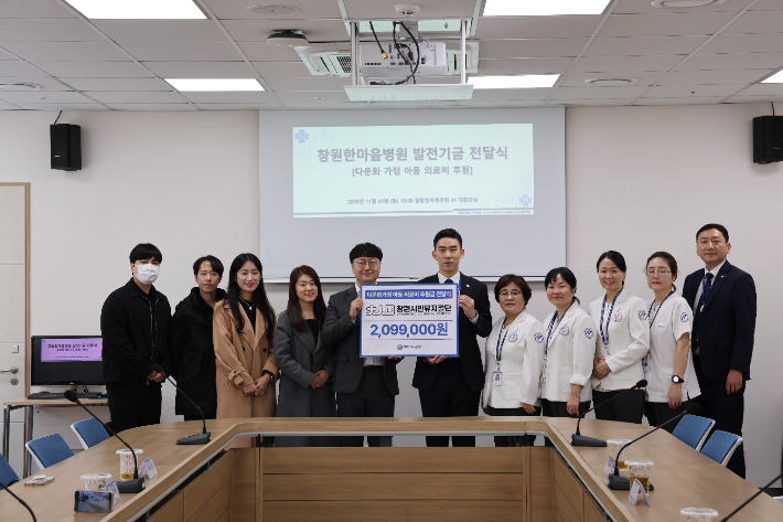 창원시민뮤지컬단, 한마음병원에 '다문화 가정 아동 의료비' 전달 창원시민뮤지컬단이 총 209만 9천원을 다문화 가정 아동 의료비 명목으로 창원한마음병원에 전달했다. 2025.12.27 17:19