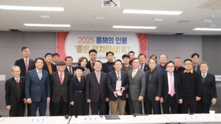 김석기 국회의원, 시민사회가 뽑은 '좋은 정치인상' 수상 김석기 국회의원(국민의힘. 경북 경주)이 범시민사회단체연합(범사련)이 선정한 '2025 좋은 정치인상'을 수상했다. 김석기 의원은 지난 24일 서울 푸른홀에서 열린 범사련 주관 '2025 올해의 인물' 시상식에서 자유민주주의와 법치주의 수호, 건전한 시민사회 발전에 기여한 공로를 인정받아 수상의 영예를 안았다. 2025.12.30 16:57
