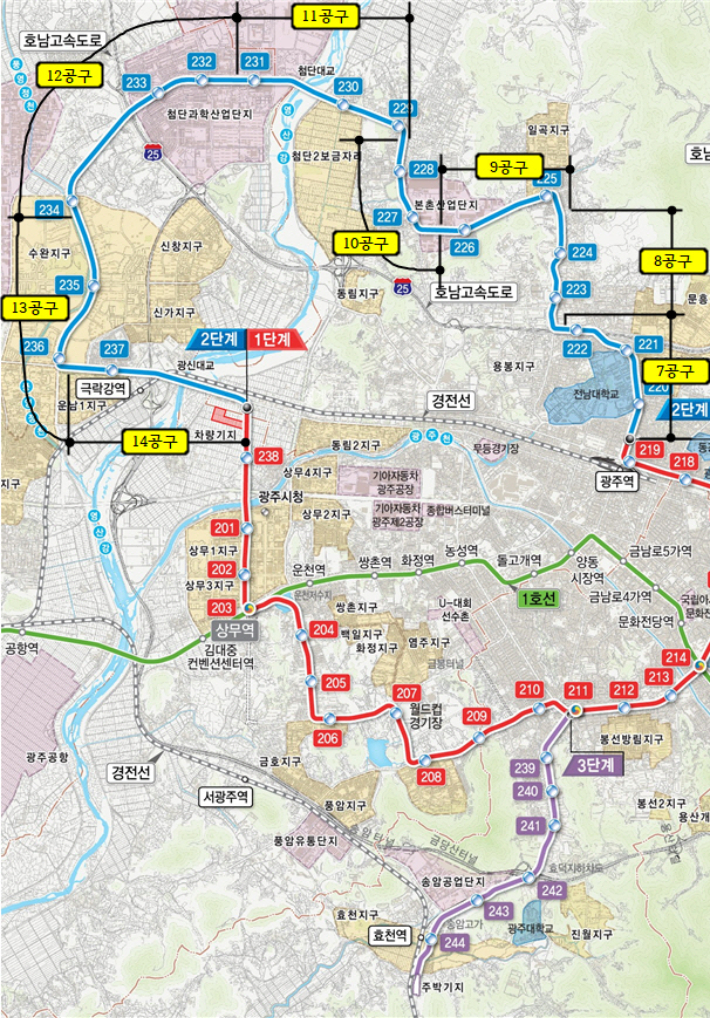광주 도시철도 2호선 2단계 13공구 공사 중단 광주 도시철도 2호선 2단계 사업의 핵심 구간인 13공구(농협유통센터사거리~운남교차로) 공사가 중단됐다. 광주도시철도건설본부는 설계 변경 필요성이 제기되면서 공정을 멈추고 대안을 검토하고 있다. 2026.01.12 11:38