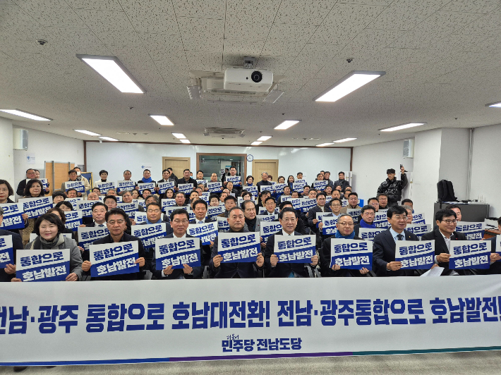 민주당 전남도당 '전남·광주 통합 광역단체장 선거 실시하기로 결의' 더불어민주당 전라남도당은 '전남·광주 통합 추진'을 만장일치로 당론 의결하고 '통합 광역 단체장 선거'를 실시하기로 결의했다. 2026.01.12 11:48