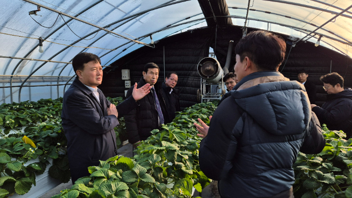 충북농협, 진천 스마트팜 농장서 새해 첫 현장경영 충북농협이 2일 진천군 스마트팜 농장 '부자농원'에서 새해 첫 현장경영에 나섰다. 이날 현장경영에는 이용선 본부장과 덕산농협 조정환 조합장, 진천군지부 김종석 지부장 등이 참여해 스마트팜 운영 현황을 점검하고 협력 방안 등을 논의했다. 2026.01.02 17:02