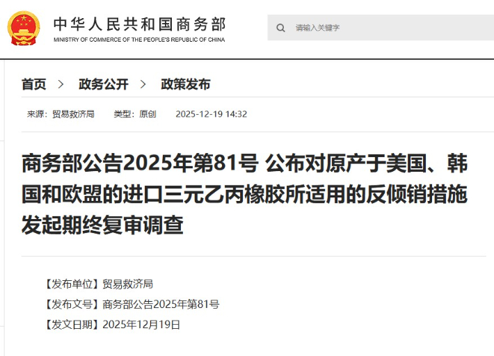 中, 韓·美·EU산 합성고무 반덤핑 관세 1년 더 유지 중국 상무부가 한국과 미국, 유럽연합(EU)산 '기능성 합성 고무'(EPDM)에 대한 반덤핑 관세 종료를 앞두고, 해당 조치를 유지할지 여부를 심사하겠다고 밝혔다. 2025.12.19 19:10
