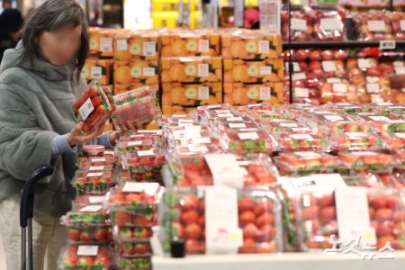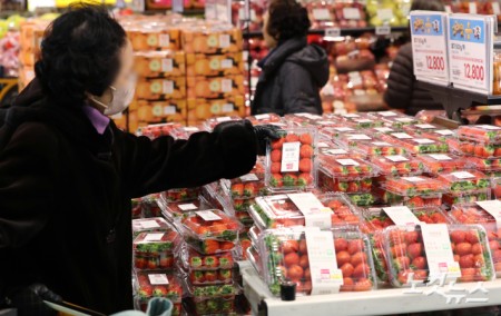 연초부터 딸기 가격 급등 딸기 가격이 연말·연초 수요 증가로 고공행진을 이어가고 있는 가운데 5일 서울 시내의 한 대형마트에 시민들이 딸기를 구매하고 있다. 지난 2일 기준 딸기 중도매인 가격(2㎏)은 4만5980원으로 집계됐다. 이는 전년 순 평균(3만3740원)보다 약 36%, 평년 순 평균(3만2558원) 대비로는 40% 이상 높은 수준이다. 2026.01.05 13:33