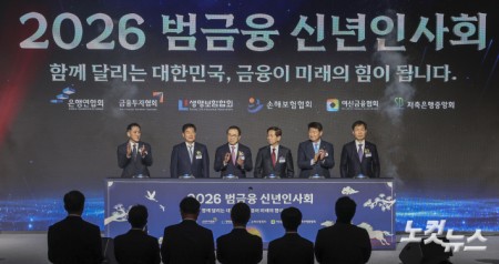 2026년 범금융 신년인사회 김준 생명보험협회 전무와 정완규 여신금융협회장, 조용병 은행연합회장, 황성엽 금융투자협회장, 오화경 저축은행중앙회장, 오홍주 손해보험협회 전무(왼쪽부터)가 5일 오후 서울 중구 롯데호텔에서 열린 '2026 범금융 신년인사회'에 참석해 기념촬영을 하고 있다. 2026.01.05 15:28