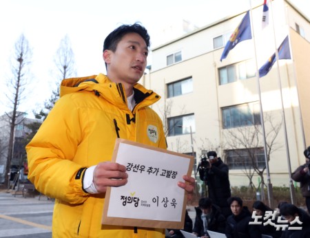 취재진 앞에 선 정의당 이상욱 강서구 지역위원장 더불어민주당에서 제명된 강선우 의원의 ‘공천헌금’ 의혹을 공직선거법 위반 혐의로 고발한 정의당 이상욱 강서구 지역위원장이 5일 고발인 조사를 받기 위해 서울 강서경찰서에 출석하고 있다. 2026.01.05 16:18