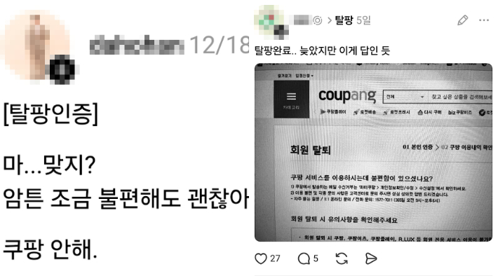"정신 차리면 가입"…'가치 소비' 시대에 '탈팡' 인증 행렬 "쿠팡이 조금이라도 경각심을 가졌으면 하는 마음이었어요" 서울 은평구에 사는 이유진(25)씨는 "개인정보가 유출됐다는 문자를 받고 쿠팡을 탈퇴했다. 여러 논란이 있고 그 대응이 제대로 이뤄지지 않아서…"라며 이같이 말했다. 이른바 '탈팡' 행렬에 동참한 것이다. 2026.01.02 05:00