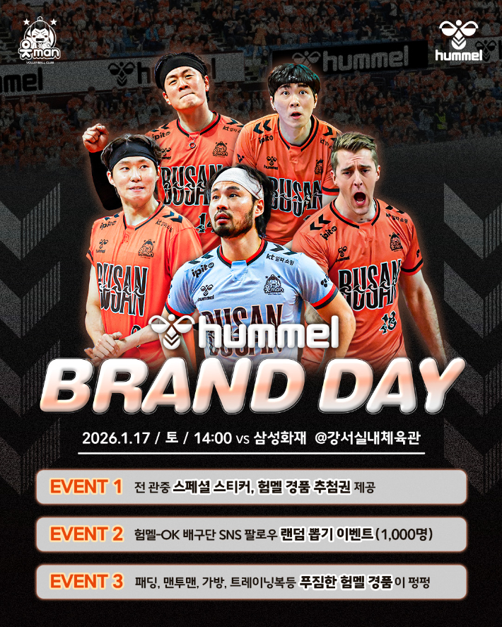 남자배구 OK저축은행, 17일 삼성화재전서 '험멜 브랜드데이' 개최 남자 프로배구 OK저축은행이 오는 17일 부산 강서실내체육관에서 열리는 진에어 2025-2026 V-리그 남자부 4라운드 삼성화재와의 홈경기에서 스포츠 브랜드 험멜코리아와 함께하는 '브랜드데이'를 개최한다고 15일 밝혔다. 2026.01.15 09:45