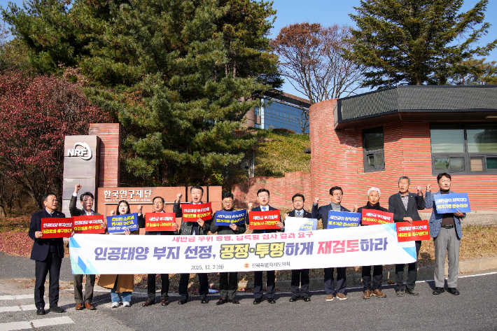 전북도의회 "인공태양 연구시설 부지 전면 재검토" 촉구 전북특별자치도의회 의원들이 2일 과학기술정보통신부의 '핵융합 핵심기술 개발 및 첨단 인프라 구축' 공모 사업과 관련해 한국연구재단 대전청사를 항의 방문했다.