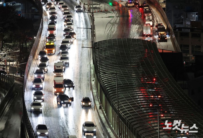 첫눈부터 폭설…얼어붙은 도로에 출근길도 '비상'[노컷네컷] 서울에 대설주의보가 내려지며 내부순환로 진입로 전 구간이 통제된 가운데 4일 서울 서대문구 홍제동에서 바라본 내부순환로에 차량들이 얼어붙은 눈길을 서행하고 있다.
