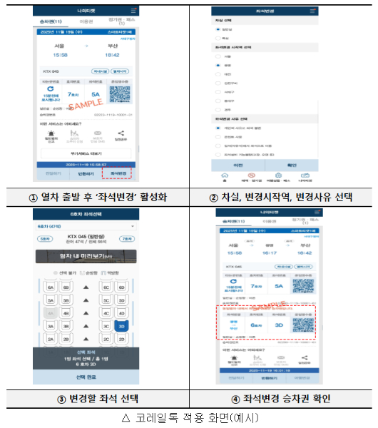 KTX 탑승 중에도 좌석 변경 가능…'코레일톡 셀프 좌석 변경' 도입 앞으로 KTX 탑승 중 좌석을 바꾸고 싶을 때 모바일 앱 '코레일톡'을 통해 직접 변경할 수 있게 된다. 한국철도공사(코레일)는 2일부터 KTX 탑승 중에도 좌석을 바꿀 수 있는 '코레일톡 셀프 좌석 변경' 서비스를 도입한다고 1일 밝혔다.